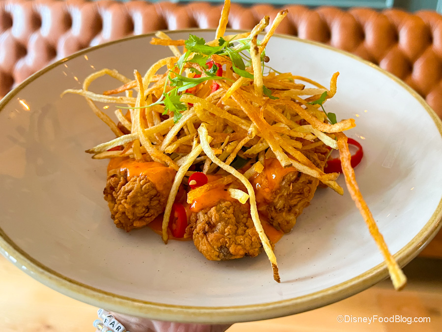 One of the selected entrees is the Bang Bang Chicken, which is buttermilk marinated fried chicken with a spicy bang bang mayonnaise. Yeah, that mayo is SUPER spicy — you can see chilis in it. If you love spicy, this could be a MUST for you. The fried chicken is nice, too. It’s served with some nice crispy shoestring fries on top.