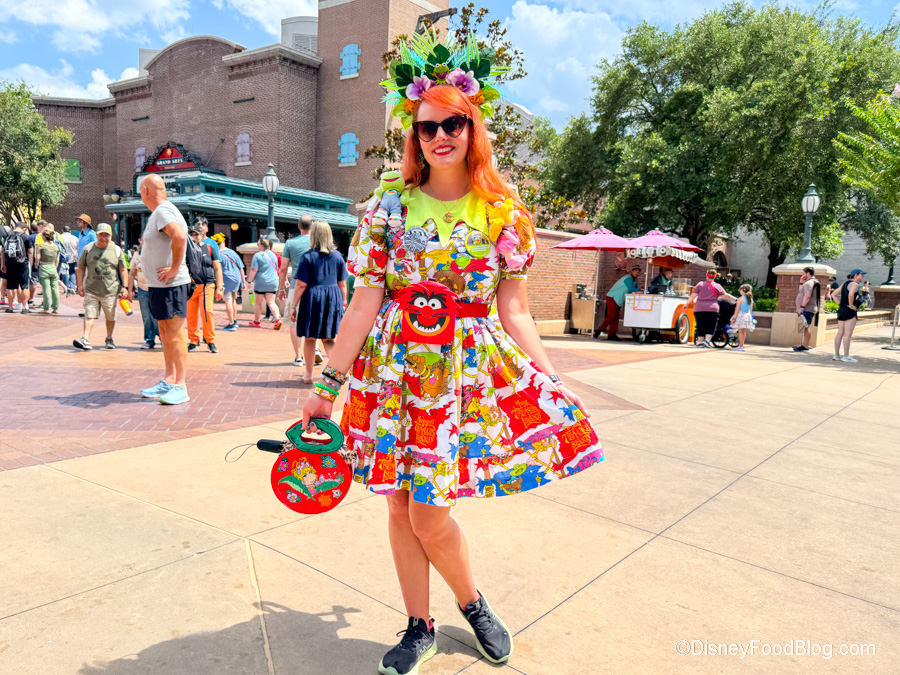 We also saw folks paying tribute to the ride by wearing some fun Muppets-inspired outfits and accessories. Melanie rolled in sporting a massive Gonzo head (oh, we hope that’s a bag) and a Rizzo plush (and it’s Rizzo dressed like Mickey from the pre-show!). Also, that Disney MGM Studios shirt is🔥🔥🔥.