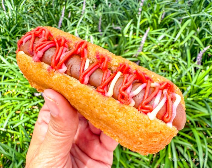 This is a cake made to look like a hot dog bun with frosting inside that mimics a hot dog and then frosting toppings on top. So again, a lot of frosting with just some cake. Luckily, the cake is tasty, and it’s texturally firmer than we typically enjoy for a cake — almost like a pound cake, which in this case is a good thing as it mimics a hot dog bun and holds all of the frosting toppings. This is, again, really cute, a novelty item, and if you’re interested in that kind of novelty item, then this is worth it. If you are not a vegan or gluten-free eater, there are definitely better treats to be had around Disney Springs.