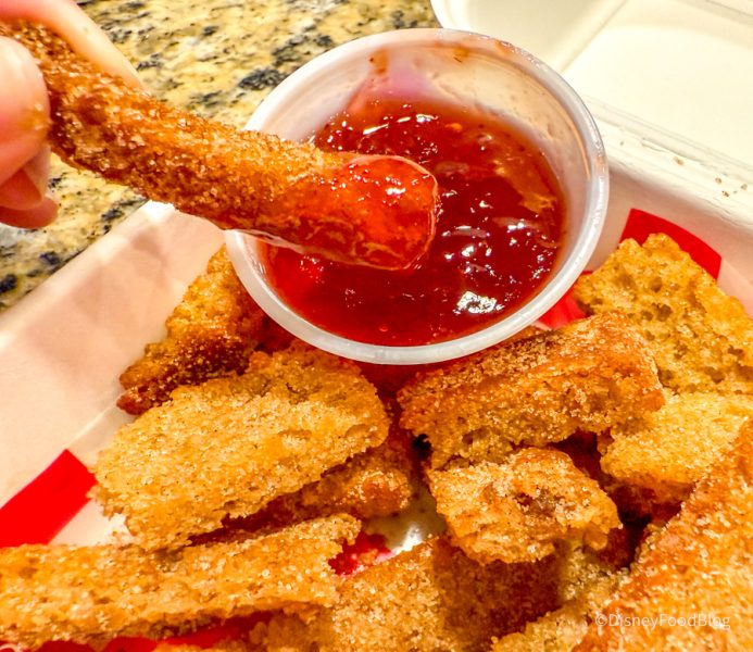 We love this take on Dessert Fries — golden vanilla cake sticks dusted with cinnamon sugar served with sweet berry dipping sauce for “ketchup.”