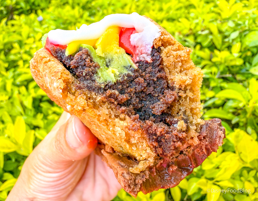 Of course, we also had to grab the Taco Cookie. Despite the name, there are no tacos here! A folded chocolate chip cookie “shell” is filled with rich chocolate frosting “meat,” yellow frosting “cheese,” green candy “lettuce”, and red candy “tomatoes.”