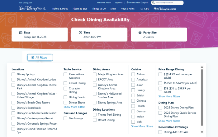All you have to do is start on the Disney World or Disneyland dining page on the website. You can either search by restaurant or search for ALL availability. There are also filters you can use to choose restaurant type and more. If you choose “Check all Availability,” you’ll need to enter your party size and a specific date, but then you’ll get a list of all restaurants with availability and you can click on “Check Availability for multiple days.”