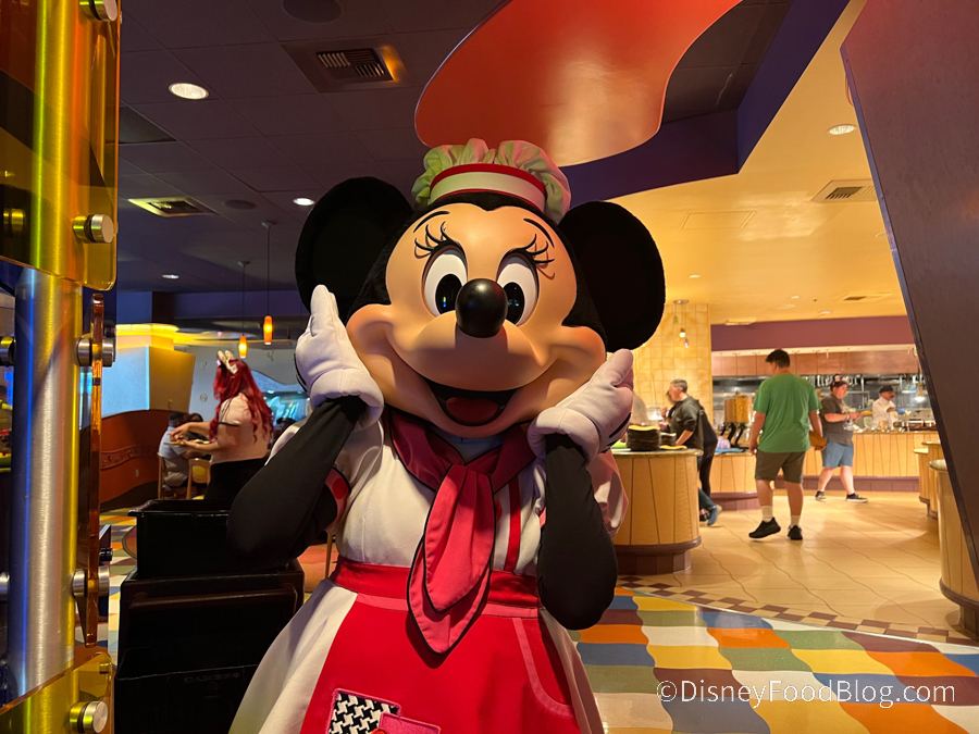 The dining areas are very colorful with lighting fixtures all around (some areas are brighter than others). However, the main draw of dining here is all the characters you can meet! While the characters can vary, I was able to meet Goofy, Pluto, Minnie, Chip, and Dale!