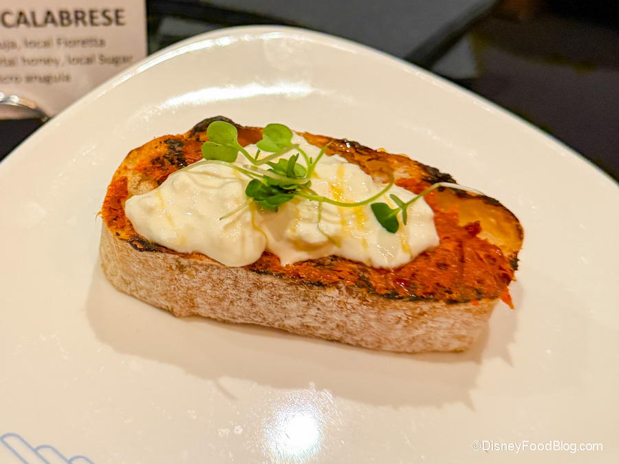 We loved the Bruschetta Calabrese, which is available at Enzo’s Hideaway. It’s grilled ciabatta topped with ‘nduja and Florida-sourced fioretta stracciatella, petal honey, and micro arugula. Everyone was raving about this. It’s nice and creamy with that touch of sweetness from the honey. The greens on top were also really nice.