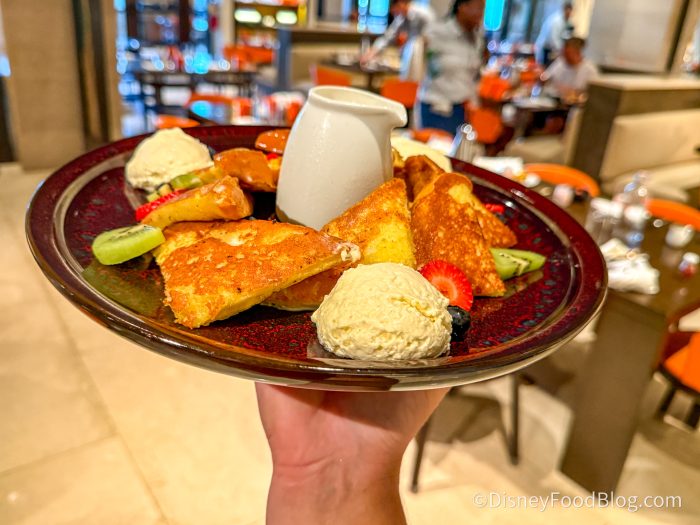But even in this sleek setting, Disney characters occasionally get in on the fun in the mornings at the “Good Morning Breakfast with Goofy and His Pals” buffet breakfast, which takes place on Thursday and Saturday mornings, as well as select Tuesdays. And when Goofy and his pals aren’t visiting for breakfast, the menu features a la carte selections in addition to the buffet. Additionally, Ravello is also open in the evening for dinner; however, for this review, we wanted to experience what all the fuss was about during breakfast and how it would set the tone for our day at Disney World.