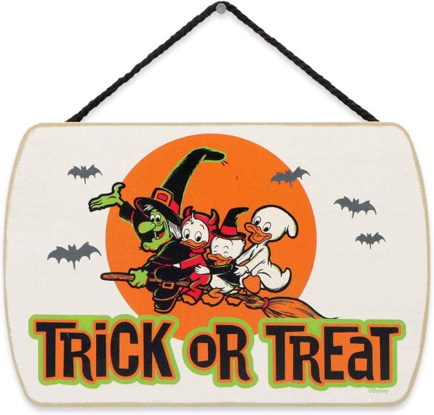 Huey, Dewey, and Louie are dressed in their iconic Halloween costumes and have hitched a ride with a witch on this Trick or Treat sign! This sturdy, yet lightweight sign is made of MDF, and it features a rope at the top for quick and easy wall display.