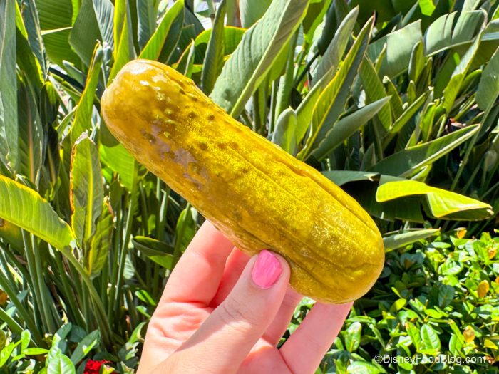 Next was the Pickle-in-a-Pouch for $2.50. It’s a pretty standard deli pickle that you can get throughout Disney World. You’ll want to eat it right away, though, because if it sits too long, it gets soft and loses its crunch and freshness. It has a nice flavor that’s pungent and tart with the brininess you expect from a pickle. It’s a pickle, y’all. And it’s a cheap snack, which might be just what you want.