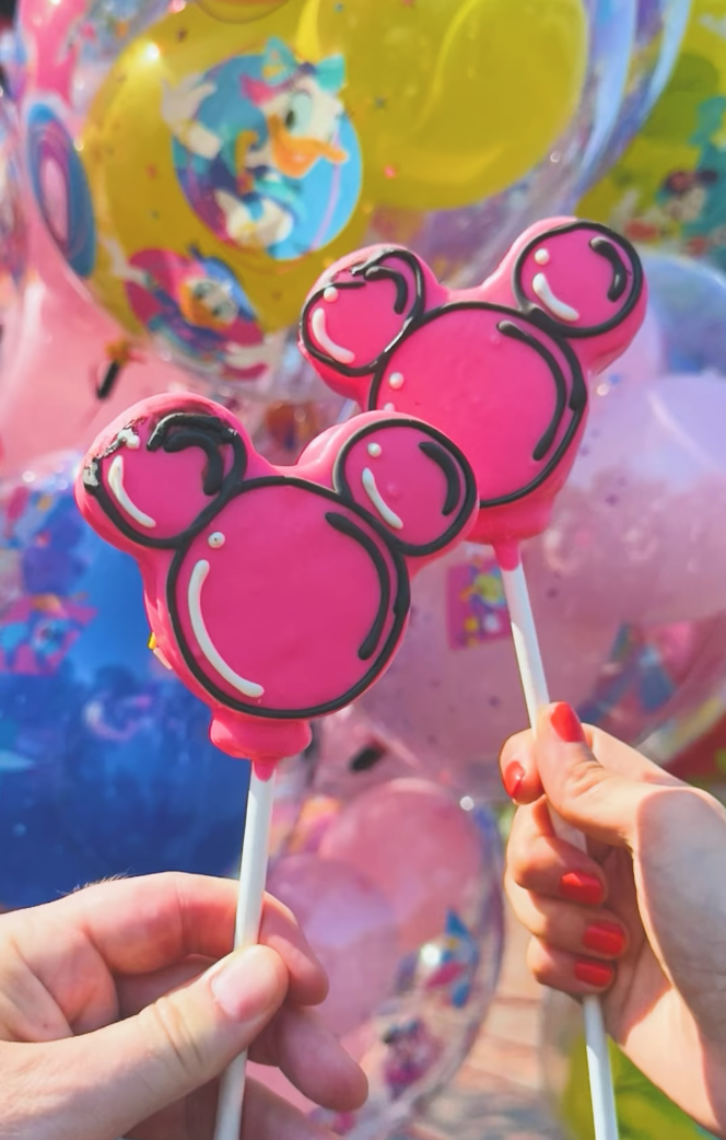 …and the Pink Mickey Balloon Marshmallow Pop, a Mickey-shaped marshmallow dipped in pink-colored white chocolate and decorated with black-colored dark chocolate and white chocolate accents.