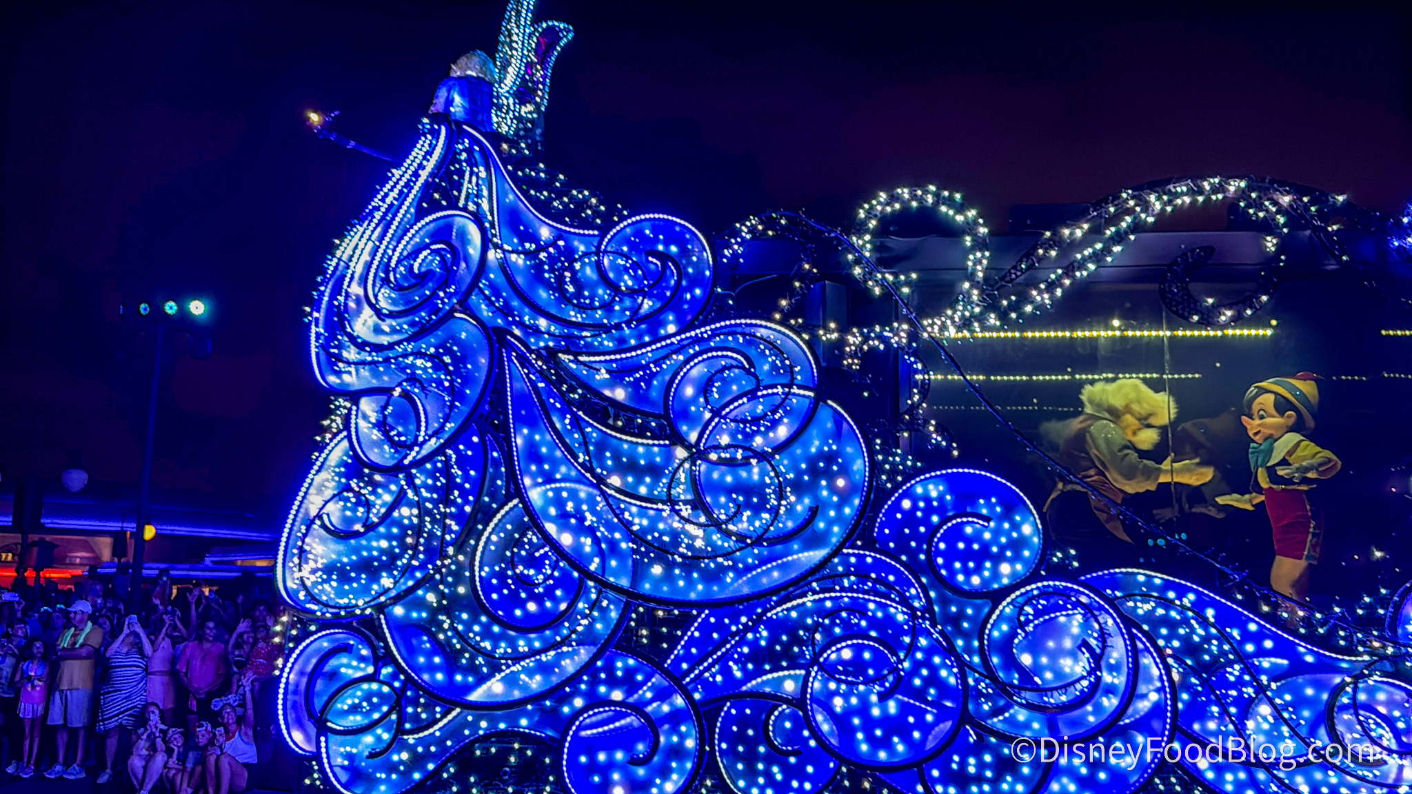 The Disney Starlight begins with the Blue Fairy from Pinocchio as the parade is brought to life! The star on the Blue Fairy’s wand will be the “first star you’ll see tonight,” and parade viewers are even invited to wish upon the star to kick off the parade. It starts with a nod to the Main Street Electrical Parade, too. She invites guests to “dream the night away.”