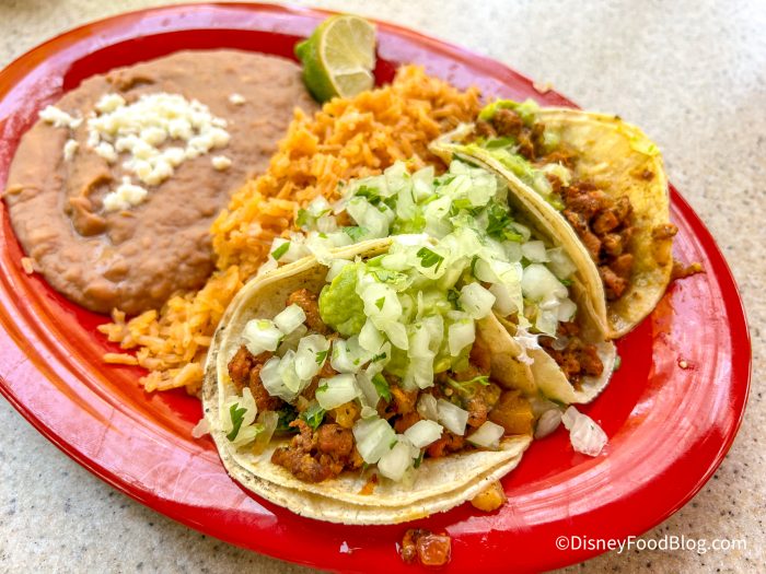 However, the salsa included with the tacos was nearly undetectable in flavor, and there was little to no spice present in the dish overall. For guests looking for a kick of heat, this may fall short. While the tacos do come with a side of rice and beans for a value comparable to Cocina Cucamonga’s offerings, the sides didn’t add much beyond filler. If you’re craving Mexican flavors at Disneyland Resort, these tacos are a good pick.