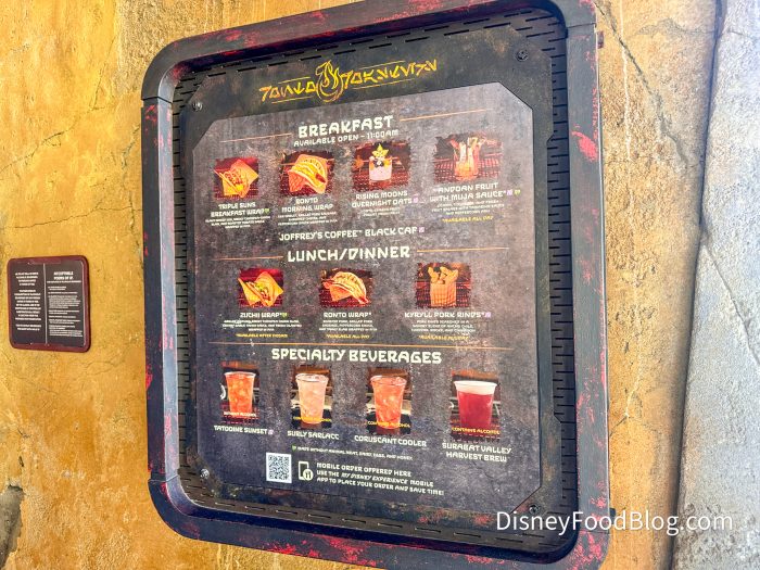 Ronto Roasters is located inside Star Wars: Galaxy’s Edge, right after you pass through the market. It has a walk-up counter, but they also offer Mobile Ordering here.
