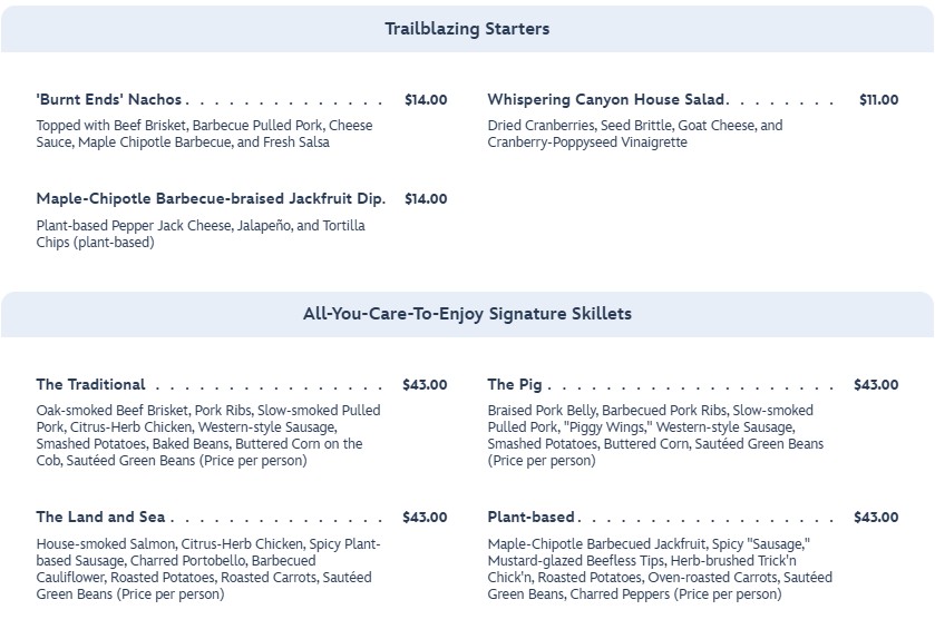 You can choose from three different starters, including the ‘Burnt End’ Nachos, the Whispering Canyon House Salad, and the Maple-Chipotle Barbecue-braised Jackfruit Dip. Whispering Canyon is known for its all-you-care-to-enjoy skillets, and you can choose from four different options. Each skillet offers a selection of food, and you can get more of anything on your skillet until you are full — or let’s be honest, absolutely stuffed!