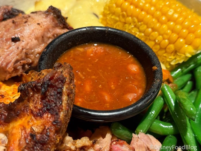 For our main meal, we grabbed the Traditional All-You-Care-To-Enjoy Signature Skillet. This costs $43, but you can get as many of the different items as you want. The skillet features oak-smoked beef brisket, pork ribs, slow-smoked pulled pork, citrus-herb chicken, western-style sausage, smashed potatoes, baked beans, buttered corn on the cob, and sautéed green beans. The price for this meal is per person, but everyone participating in the skillet will have dibs to grab from the overall meal placed at the table.