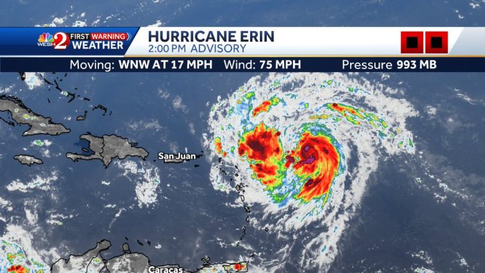 Erin is projected to form into a Category 4 Hurricane. As of right now, Erin is located several hundred miles east of the northern Leeward Islands. We can expect heavy rainfall, so places such as the U.S. Virgin Islands, the Leeward Islands, and Puerto Rico should be aware of possible flash flooding.