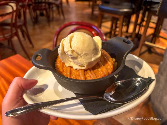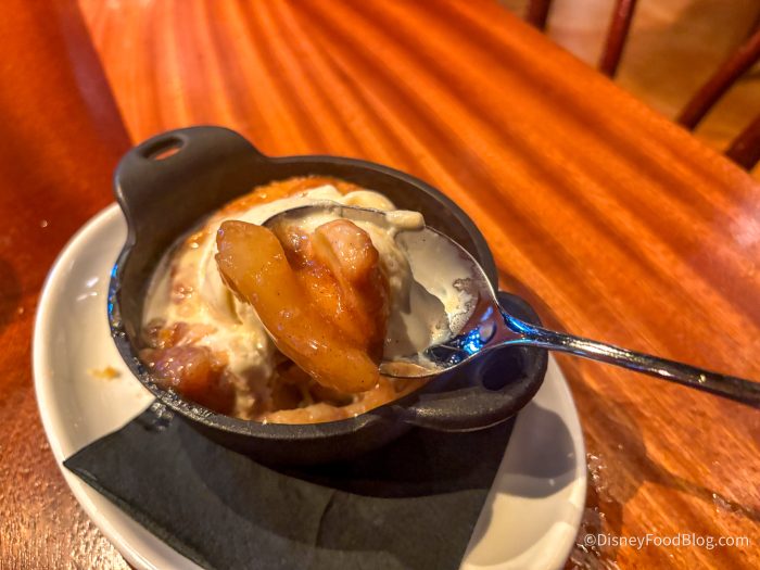The apples were coated in a sticky syrup with lots of cinnamon flavor, so much so that the bourbon toffee sauce was a bit hard to taste over the rest of the flavors, but we did get a slight hint of toffee. It added some complexity that we really enjoyed!