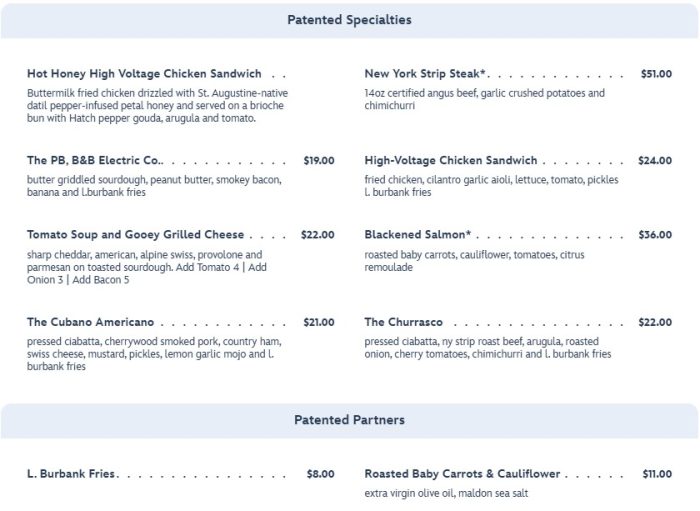 The Edison also has a list of their patented specialties, which are entrees, and their patented partners, which are sides.