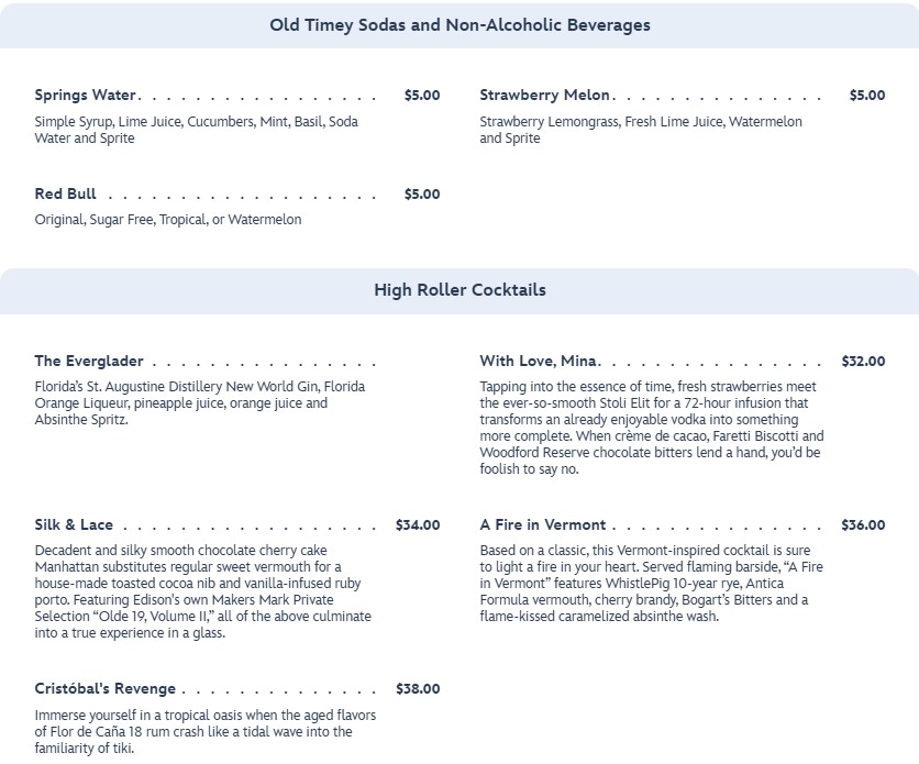 One thing that The Edison does not lack is options for drinks! You can grab an old-timey soda, a non-alcoholic beverage, or a high roller cocktail.