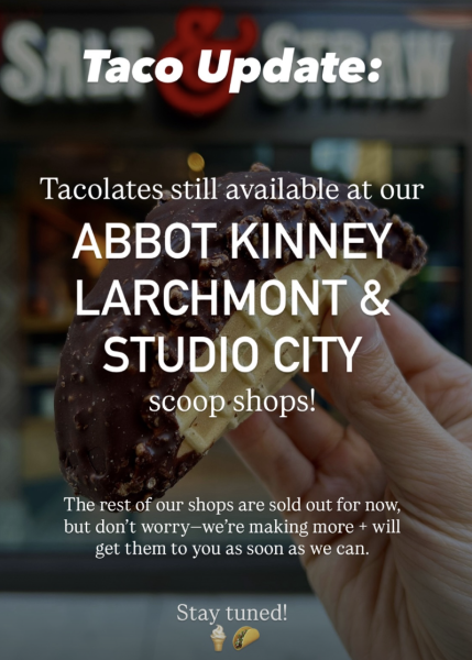 These went available on Friday, October 3rd. The tacos will be available at participating Salt & Straw locations across Oregon, Washington, California, New York, Florida, Nevada, Arizona, and New England, as well as online through Salt & Straw’s website. However, as of Sunday, October 5th, only 3 locations still have them: Abbott Kinney, Larchmont, and Studio City. The rest are sold out for now, but Salt and Straw let everyone breathe, and they will be making more!