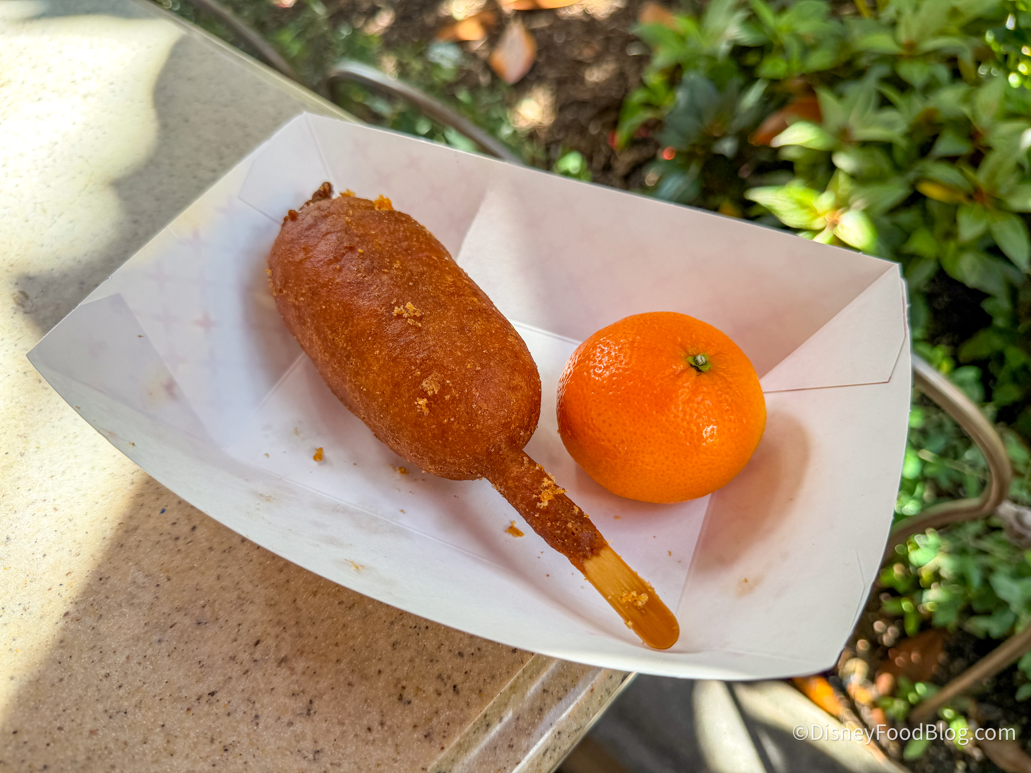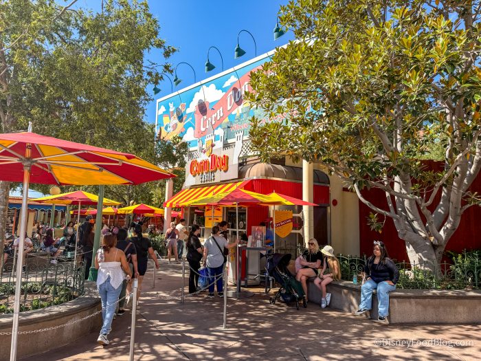 Corn Dog Castle is an outdoor kiosk type location with outdoor seating where you can try Disneyland’s classic corn dog! This restaurant is more tucked away near the Paradise Gardens section of the park, in between Goofy’s Sky School and Seaside Souvenirs.
