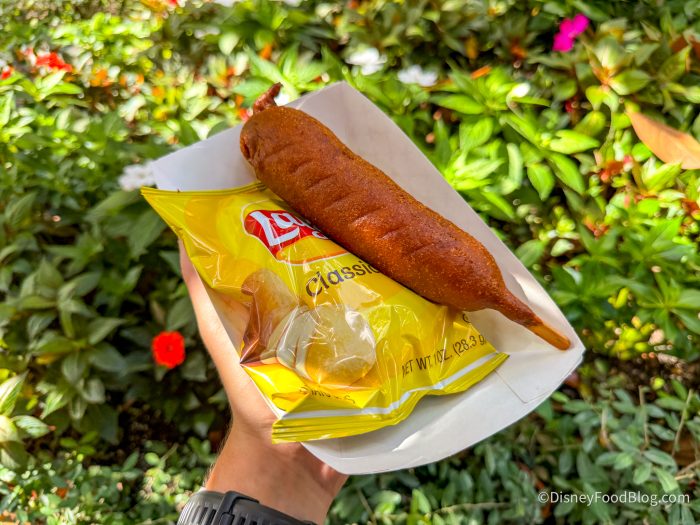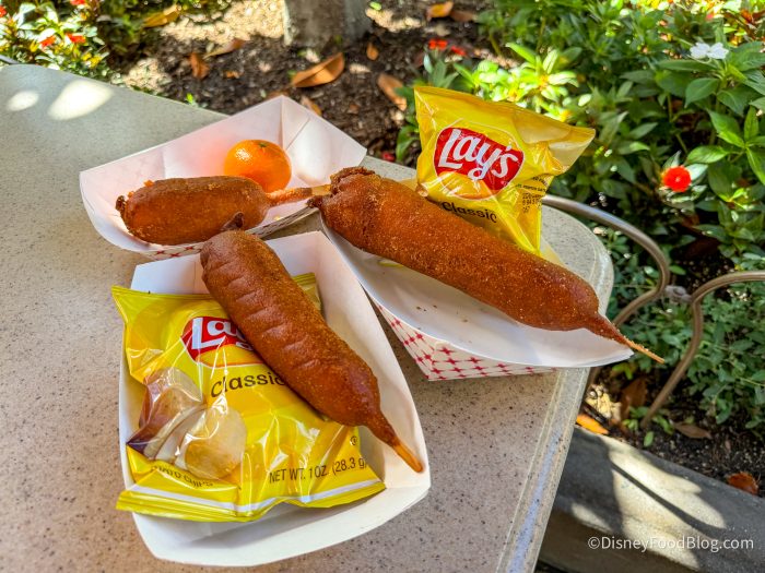 The menu here is pretty limited, as it’s only focused on, you guessed it, corn dogs! Specifically, you can grab a Hot-Link Corn Dog, Original Corn Dog, or the Cheddar Cheese Stick. Each one is served with your choice of a Cuties orange or a bag of chips. To drink, you can grab a few different sodas, Bottled Water, Hot Cocoa, or Coffee.
