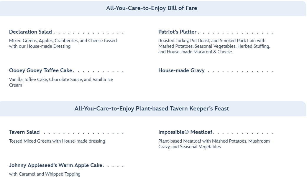 The menu here is all-you-care-to-enjoy, and the food is brought right to your table for $45 per adult and $24 per child. You’ll start your Bill of Fare with the Declaration Salad, along with bread and butter. Then you’ll get the Patriot’s Platter, which is all your favorite holiday foods. Finally, it’s time for dessert, which includes the Ooey Gooey Toffee Cake. You can also get a plant-based version of the meal.