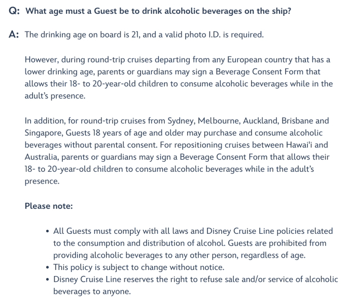 So, if your Disney Cruise leaves from a European port with a drinking age under 21, parents or guardians can sign a “Beverage Consent Form” that permits 18- to 20-year-olds to consume alcoholic beverages aboard the ship, but only while in the presence of that parent or guardian. And if you’re taking a roundtrip cruise from a port in Australia or New Zealand — 18- to 20-year-olds can drink alcohol without parental consent. Same goes for Singapore — where the Disney Adventure is set to cruise from starting in March 2026. (Who knew?!? I mean meany YOU knew? If you did, tell me cause I want to see if you know any other secret cruise things that I need to download.)