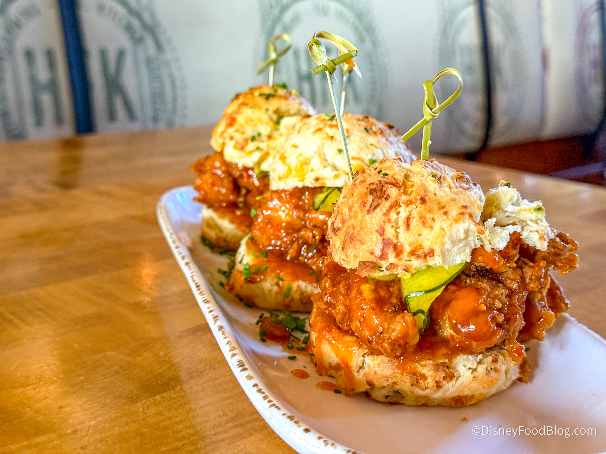 These are BIG and filling, so we honestly recommend getting them as an entree, or splitting them with at least one other person in your party if you want to save room for the rest of your meal. The hot honey here isn’t too intense, but if you’re super sensitive to spice, it’s something to be aware of. The biscuits are the same cheddar biscuits we know and love, and the chicken was nice and crispy while also being tender.