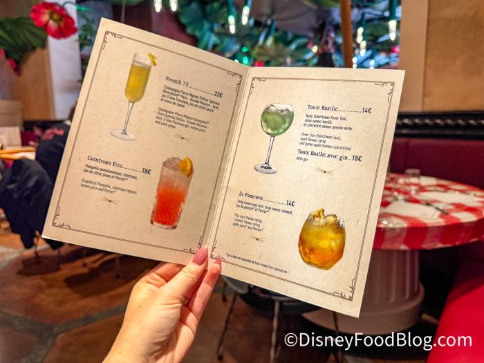 We got a few things to drink, starting with the French 75 for €22. This was a Champagne Pierre Mignon Disneyland Paris Special Edition – Grande Réserve – with G’vine Floraison gin, lemon juice, and cane syrup. This drink was very nice — the waitress told us that there’s a regular who goes there and orders this three times!