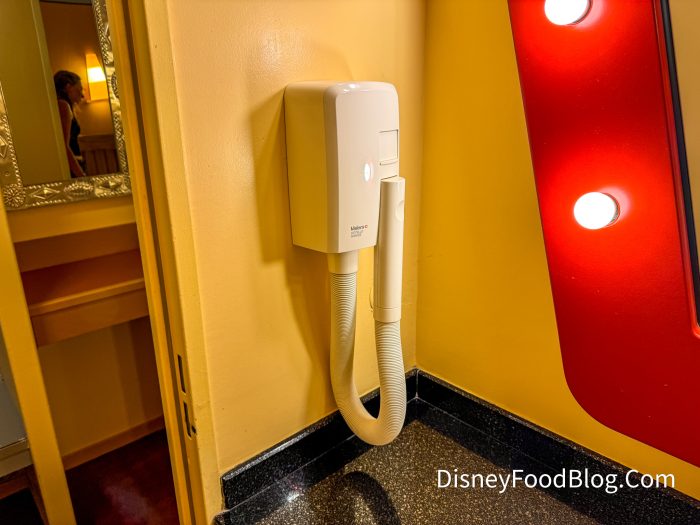 There’s also a hair dryer built into the wall, so you have one less thing to plug in and pack.