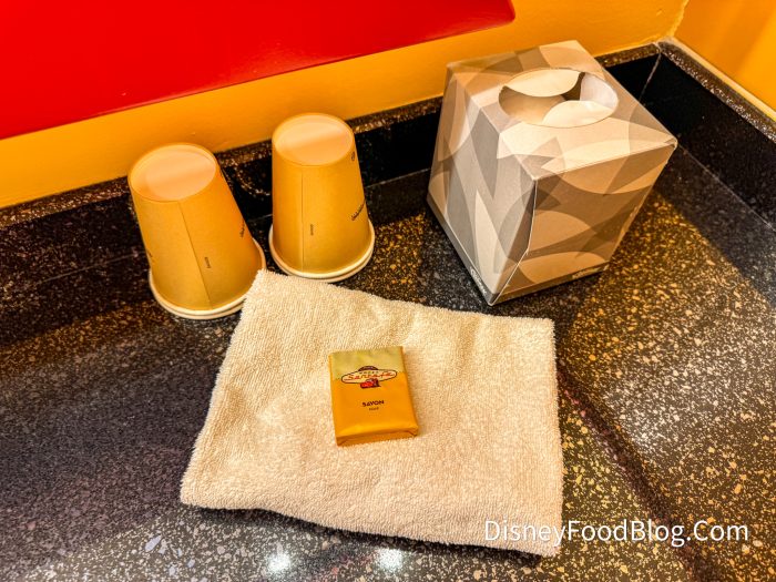 There were cups, tissues, and a bar of soap for you to use as needed.