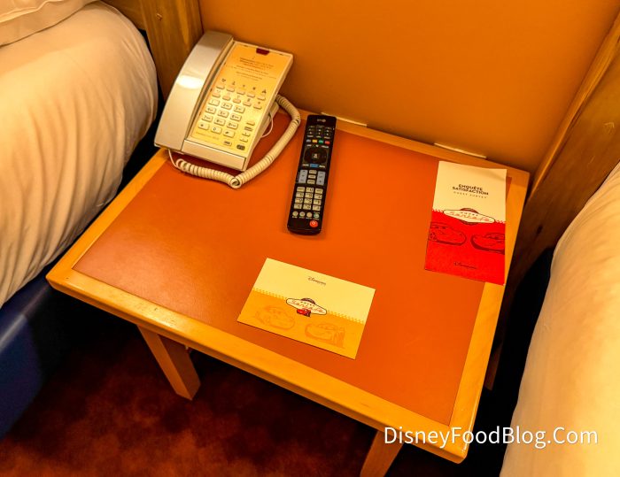 Even the mirror and lamp were shaped like a traffic cone, which we thought was super cute! The TV also had Disney+ on it, which you could watch even if you didn’t have a subscription as part of the resort’s perks. There was only one outlet by the dresser.