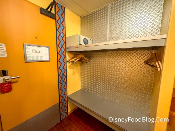 When you first enter the room, you’ll spot the closet behind the door. It’s an open closet with two shelves, several hangers, and a safe for you. This is where most of our things stayed once we were unpacked and settled.