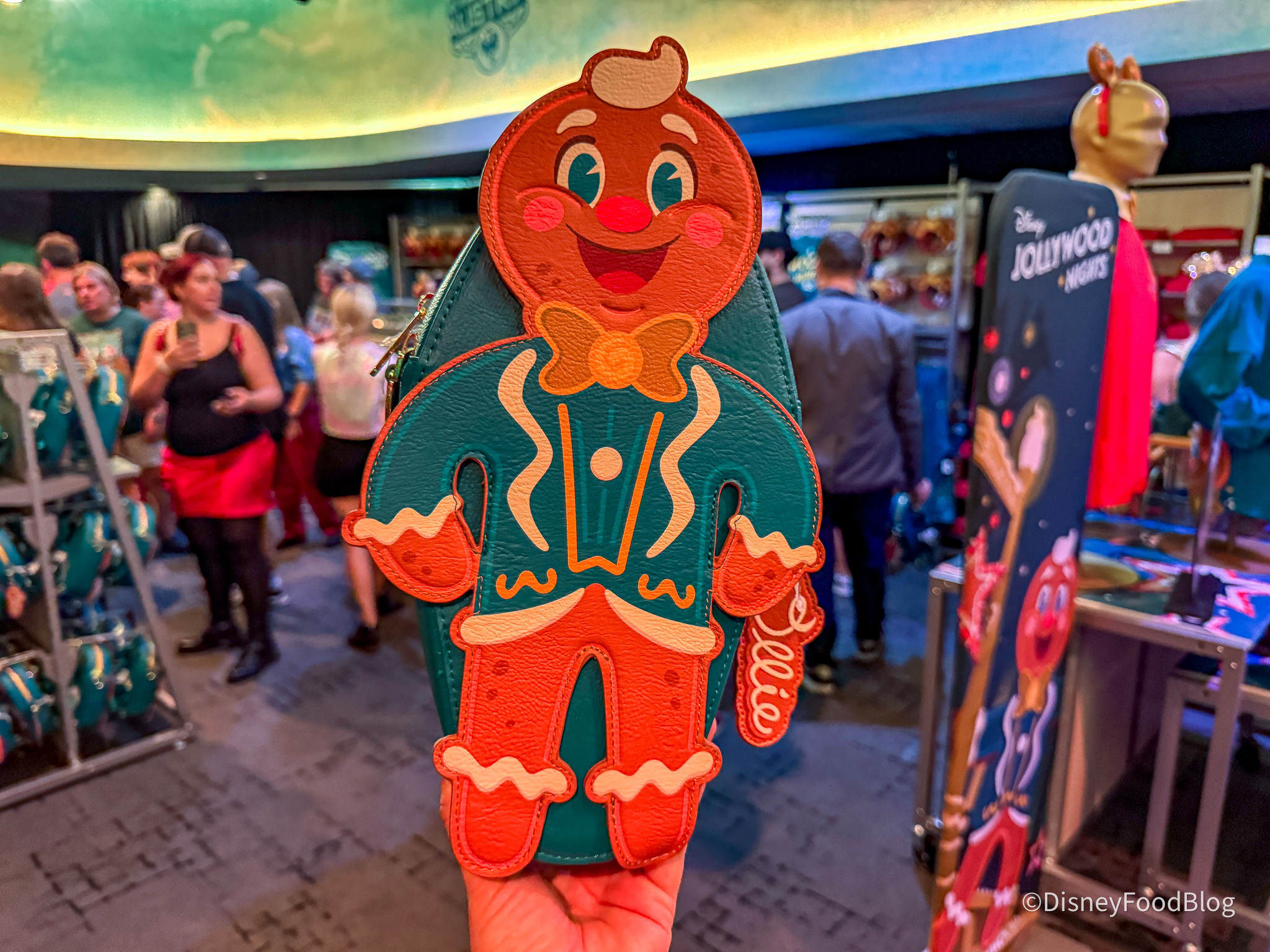 Starting us off, we have the Ollie Gingerbread Loungefly Bag! The mascot for Jollywood Nights is this friendly gingerbread man named Ollie, and now you can get a backpack to celebrate your night on the town.
