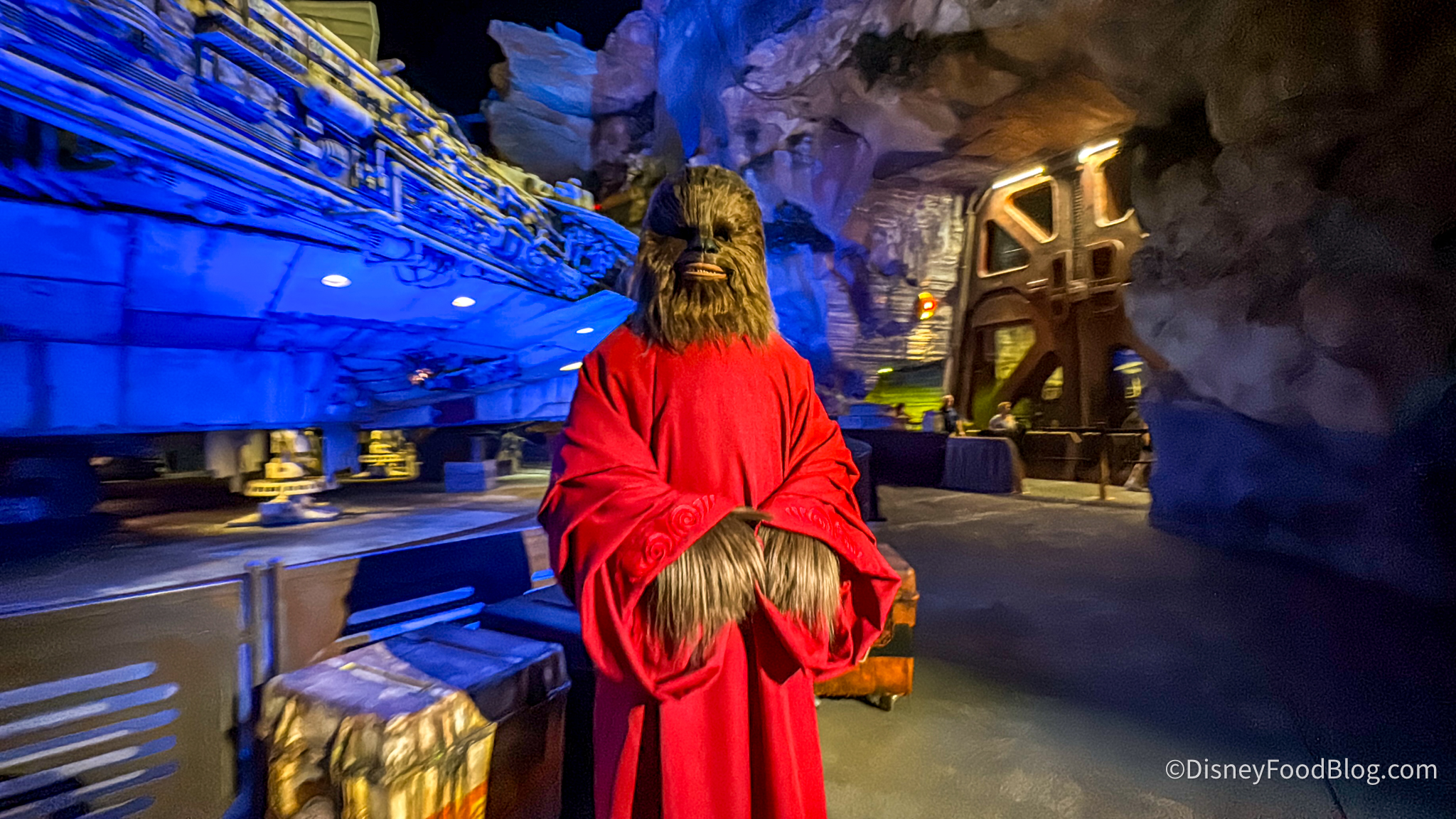 Right nearby in Galaxy’s Edge, you can see Chewbacca celebrating Life Day! Since they don’t celebrate Christmas on Batuu or in the Star Wars universe, Chewbacca’s here to spread the Life Day spirit.
