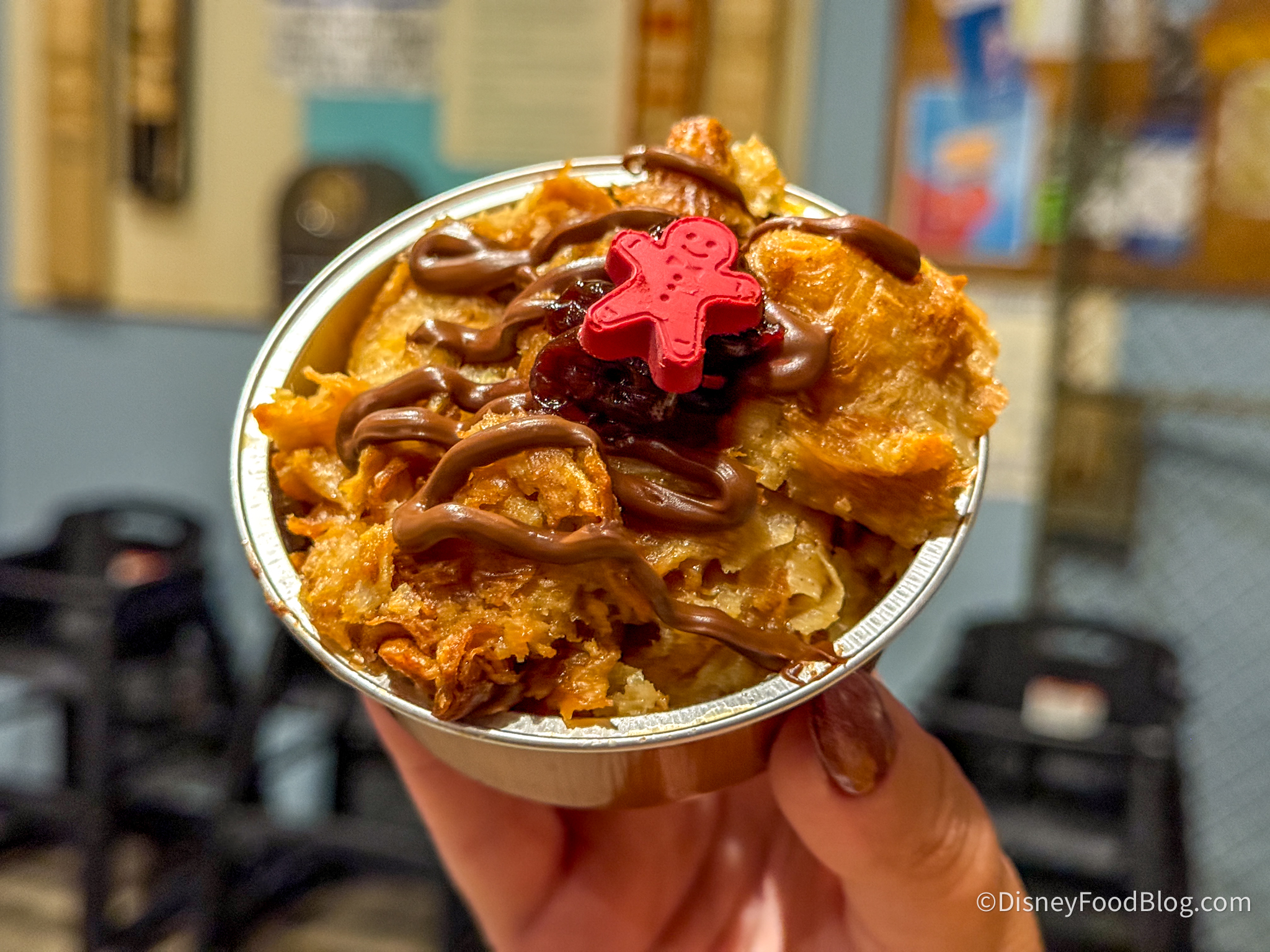 For dessert, you can grab the Holly Jolly Bread Pudding, which is Warm bread pudding swirled with chocolate-hazelnut spread and topped with cherries, holiday sprinkles, and a chocolate gingerbread man for $5.49. A Cast Member told us that kids are LOVING this one, and while we enjoyed it too, we wished it had been a bit more gooey. We also would have loved a little more of a sweet icing as well as a cinnamon flavor, but we still think it’s a great choice for those wanting something sweet.