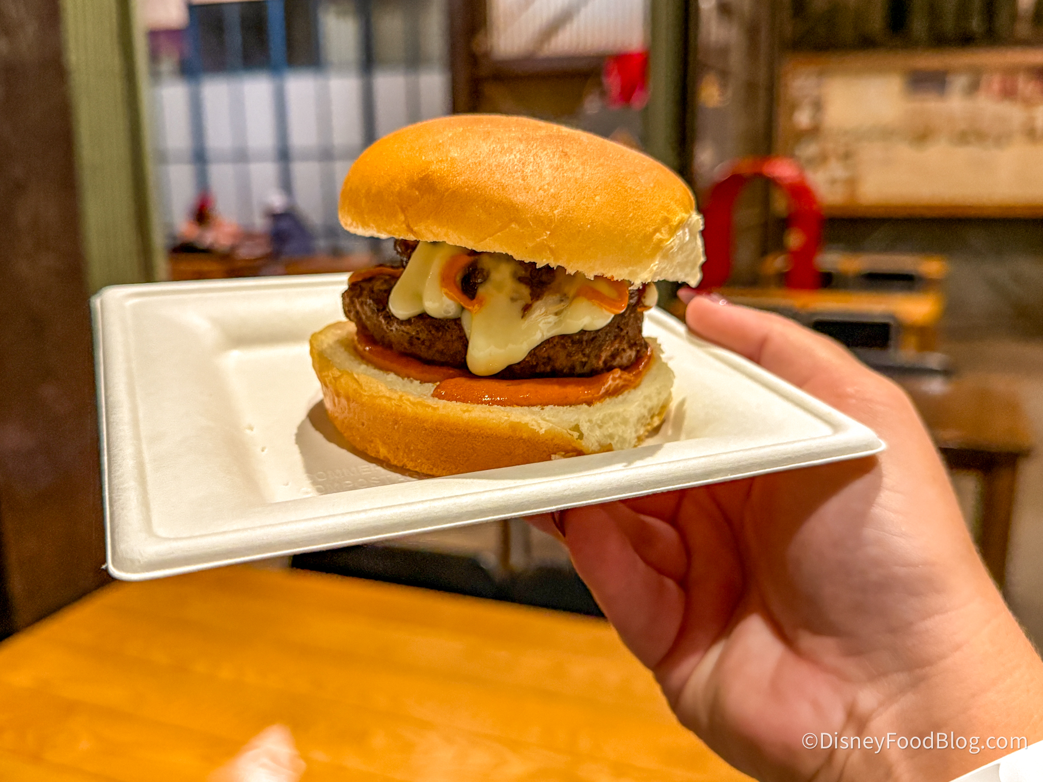 The Jolly Jam Slider is an Angus burger with bourbon-garlic-bacon jam, smoky paprika aïoli, and chili pepper sauce served on a Hawaiian roll for $6.29. The sauces here really sold it, and we did appreciate that the burger was a thicker Angus burger situation. It was a step up from Disney’s classic “meh” burgers, so if you want the flavor profile without getting something massive, this is the way to go.