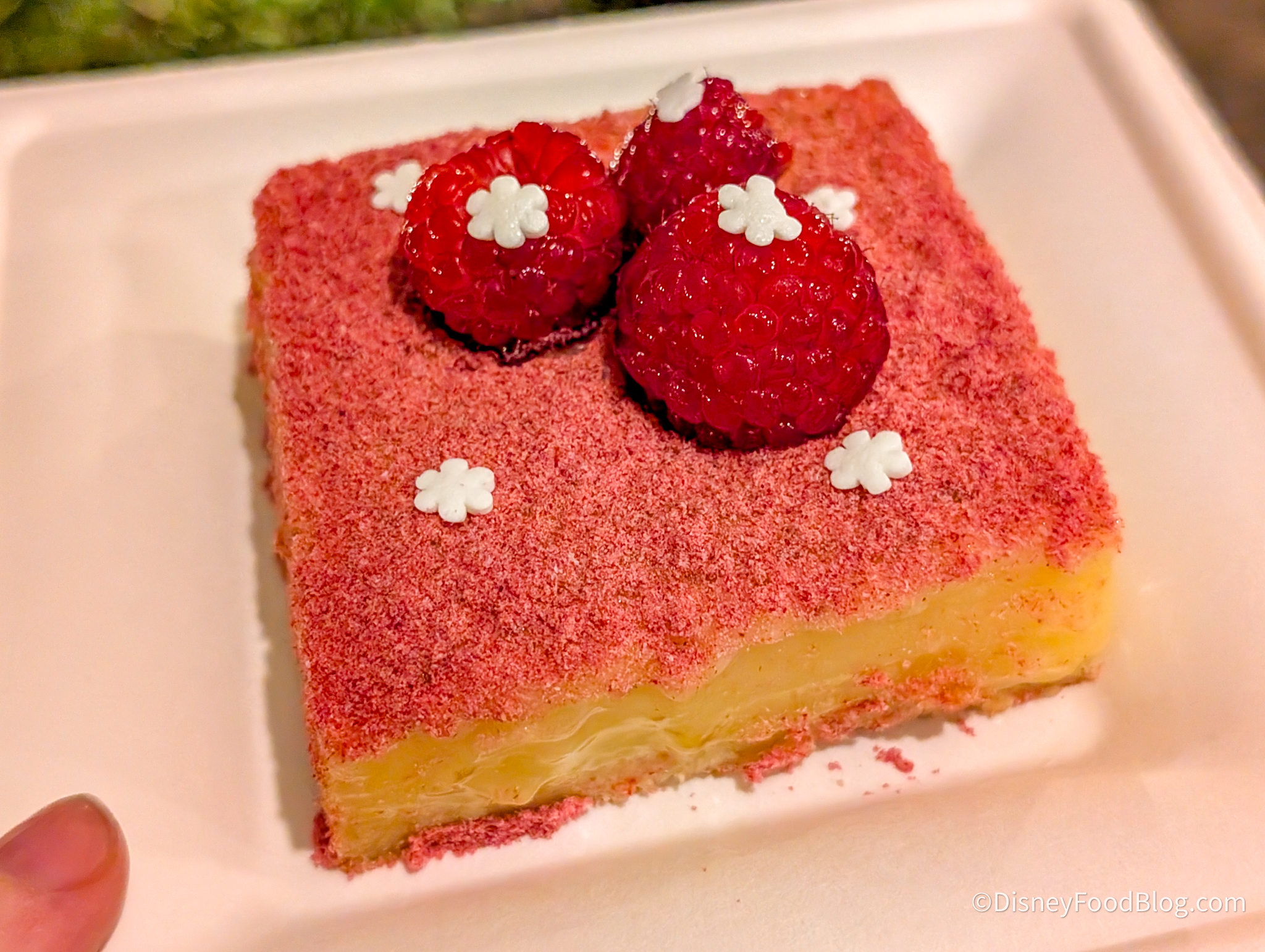 To eat here, the Raspberry-Lemon Square is available for $4.99, which is Lemon filling topped with raspberry powdered sugar and glazed raspberries. While we wanted to love this one, you could get a better lemon square from your local coffee shop, and we don’t really think this one is worth the spend. The raspberry powder on top was more like a candy powder, which was unique on its own, but wasn’t enough to save the lemon bar.