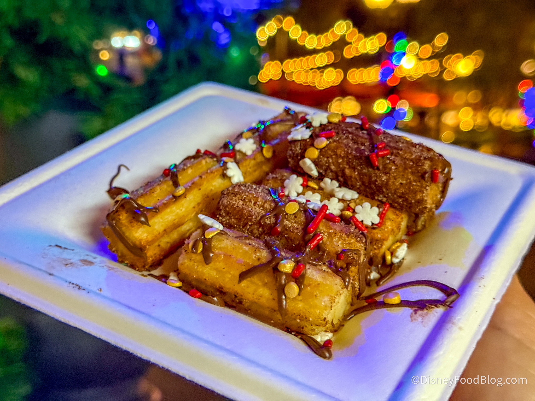 The Jolly Gingerbread Mini Churros, which are gingerbread churros with chocolate-hazelnut sauce and holiday sprinkles, can be yours for $5.29!