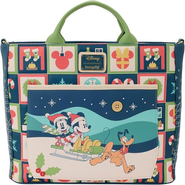 If you aren’t a fan of the backpack style, this convertible Mickey Holiday Loungefly Tote might be for you! At a glance, you’ll spot Mickey Mouse and Minnie Mouse sledding together with Pluto. Behind that is a delightful mix of icons from embroidered stockings by the fire, Mickey-shaped ornaments, wreaths, and even quilting that mimics evergreen trees on the side panels. It can be used as a standard tote bag or as a backpack!