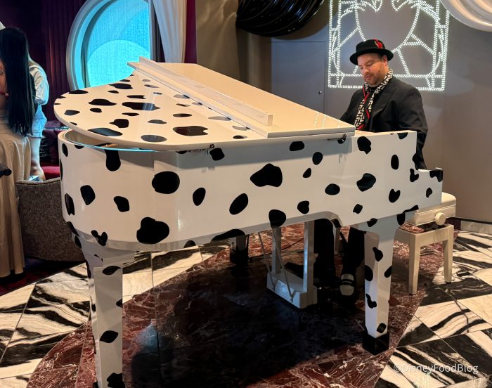 De Vil’s is a one-of-a-kind piano lounge onboard the Disney Destiny, and we were thrilled to take a step back inside. The bar has a Hollywood Regency-inspired aesthetic and is red, white, and black all over.