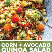 The perfect summery quinoa salad – fresh corn, buttery avocado, nutty quinoa, juicy marinated tomatoes, and tons of fresh herbs.