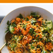Paper-thin veggies, a shower of herbs, a pile of fried crispy red curry rice, and a limey garlicky vinaigrette all over top. This crispy rice salad is all I want to eat right now!