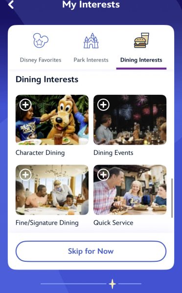 Finally, Dining Interests let you select restaurant service styles and experiences that are of interest to you, which is especially helpful if you don’t have any specific restaurants in mind yet. Choose from categories including Character Dining, Fine/Signature Dining, Quick Service, and more.