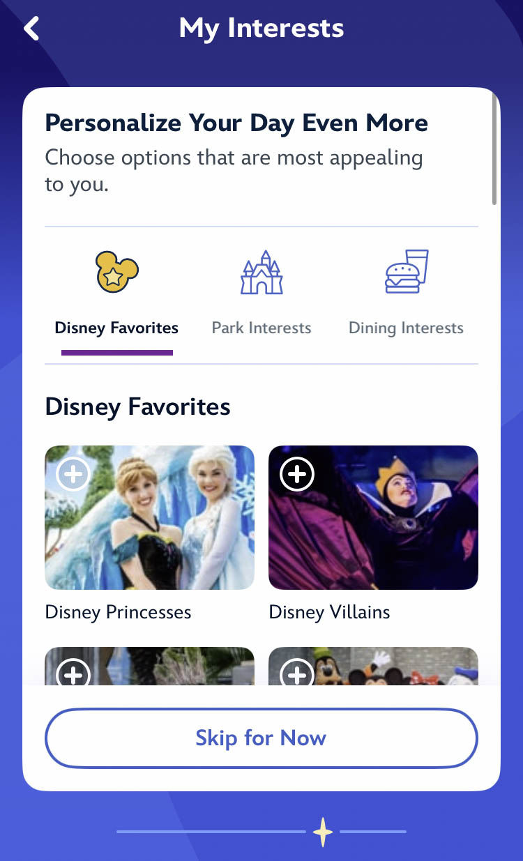 Next, you can inform the Genie of additional preferences under My Interests. These include more general headings such as Disney Favorites (which include Character Groups such as Disney Princesses or film franchises like Star Wars).