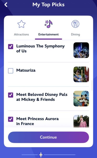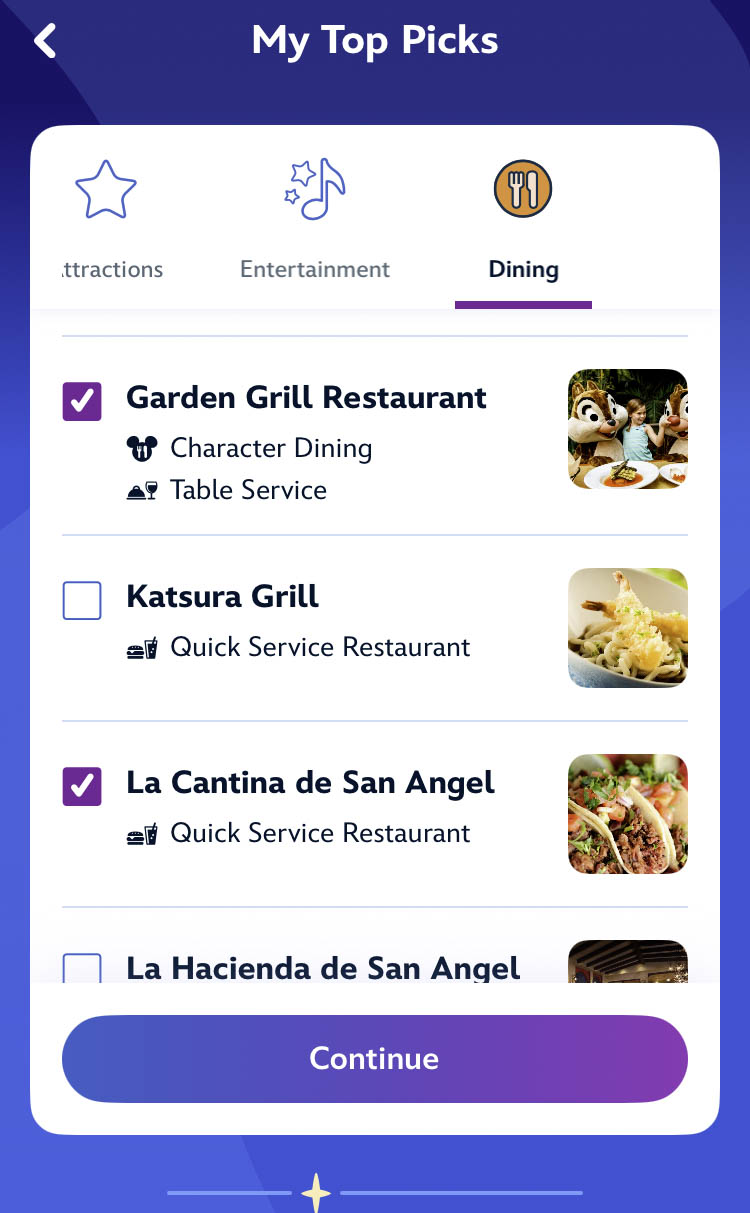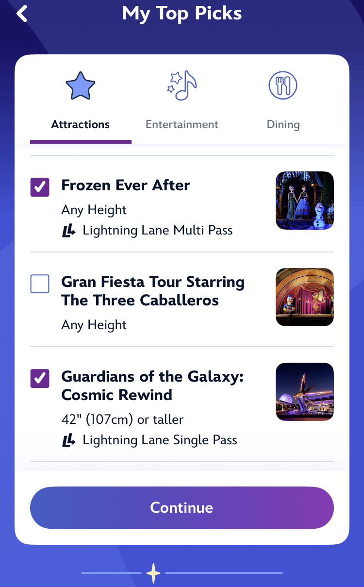 From here, you can “tell the Genie your wishes” — or your Top Picks — when it comes to three major categories: Attractions, Entertainment, and Dining! In our example, we have chosen EPCOT as the park we are visiting. You can scroll through the entire list under the Attractions icon and add a check to all of your Must-Rides.