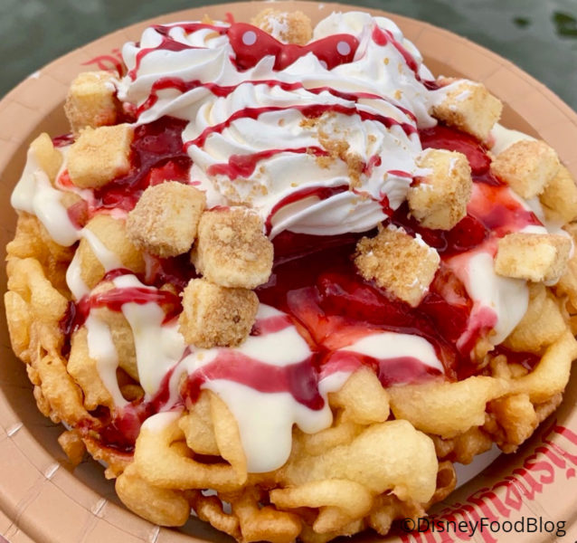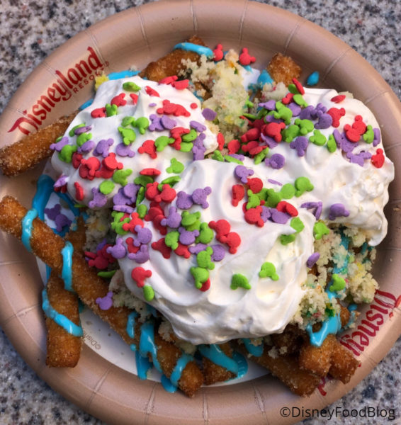 - Celebration Cake Funnel Fries – Funnel cake fries topped with crumbled confetti cake, frosting, whipped cream, and Mickey sprinkles