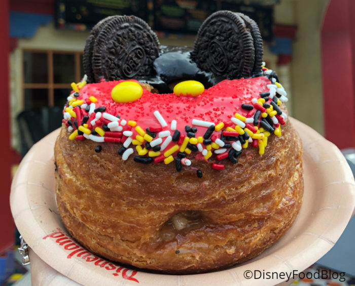 - Mickey Mouse Celebration Churro — Warm chocolate churro drizzled with cookie butter topped with Mickey confetti and served with a side of red marshmallow crème and classic Mickey buttons
