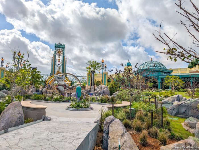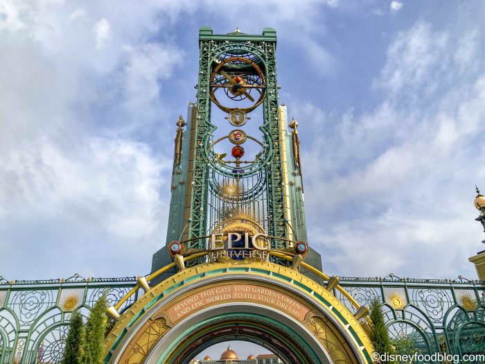 When you step into Epic Universe, Celestial Park provides the grand entrance to the new theme park! You’ll enter underneath the Cronos Tower. The inscription reads: “Beyond this gate, find gardens green and epic worlds to fill your dreams.”