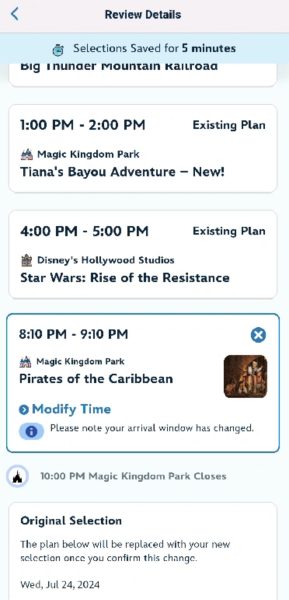 You can use this method after you have made all of your initial selections and confirmed your purchase. This tip can help you find better times for attractions that you have already booked. When you are on the main screen, tap on the selection you are looking to modify the time for and then select “Modify Plan” in the pop-up.