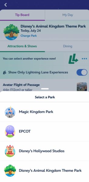 In the screenshot below, we purchased Lightning Lane Multi Pass for Animal Kingdom (as you can see at the top of the image). Because we have a Disney World Annual Pass, which includes the option to Park Hop, the My Disney Experience app provides the option to “Select a Park” to choose a new Multi Pass option in any of the other three theme parks, or we could opt to stay in Animal Kingdom.